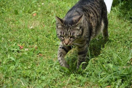 Wir saßen im Sommer nachts auf der Fensterbank im Schlafzimmer und haben auf die Träume unserer Dosis aufgepasst. Da es so warm war stand das Fenster nachts immer offen, aber es war so eine Art Gitter da. Es konnte nix passieren. Auf einmal meinte Jerry, sie müsse mich unbedingt putzen. In diesem Moment wollte ich das Ganze aber überhaupt nicht und hab mich gewehrt. Plötzlich gab es einen sehr lauten Knall und wir sind vor Schreck zu den Futternäpfen gerannt. Was war das?? Nachdem aber unsere Dosis wieder seelenruhig weiterschliefen haben wir uns auch wieder auf die Fensterbank gehockt. Ich hab mich wie immer etwas gegen das Gitter gelehnt, doch das war in diesem Moment ein sehr großer Fehler. Plötzlich flog ich einige Meter in die Tiefe und war in lauter Gras gelandet. Ich war so erstarrt vor Schreck, dass ich mich zuerst gar nicht bewegt hab. Ich hab dann ganz laut meine Dosis nach mir rufen hören. Da bin ich noch mehr erschrocken und erstmal unter einen Busch gerannt. Später war Mama draußen und hat mehrfach nach mir gerufen, aber ich konnte mich vor lauter Schreck noch nicht bewegen. Später sind Mama und Papa wieder in ihrem Stinkeding weg und ich war allein. Was war das alles hier?? Sollte das bedeuten, dass ich draußen war und endlich die rote Katze verscheuchen konnte?? Ganz langsam, jetzt schau ich mir erstmal alles ganz vorsichtig und sehr genau an. So begann ich ganz langsam um das Haus zu laufen. Ich versuchte alle Gerüche aufzunehmen und einzuordnen. Das war aber so viel auf einmal nach diesem Schreck, dass ich mich irgendwann unter einen Baum legte und sehr lange schlief. Der Hunger hat mich dann wach gerüttelt und ich bin weiter gelaufen. Plötzlich fand ich eine Schale mit diesem trockenen Fressen. War das von meiner Mama für mich?? Ich probierte davon und es war in diesem Moment das beste was ich je gefressen hatte. Ich machte die Schale komplett leer, ich war kurz vor dem Hungertod. Danach bin ich vorsichtig weiter durch mein neues Revier und hab natürlich auch gleich überall meinen Duft da gelassen. "Hier herrscht ab jetzt Tommy mit Prinzessin Jerry!"
