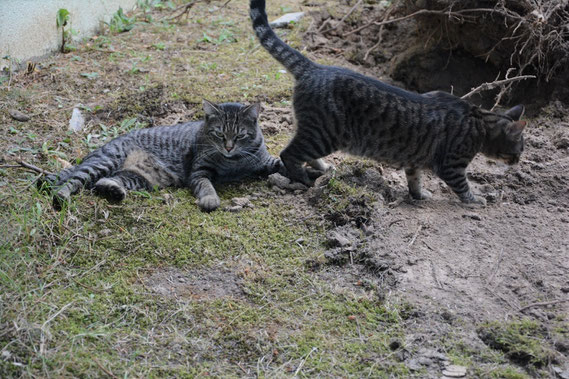 Da ist auch so eine 3er-Gruppe immer durch unseren Garten marschiert. Wir haben versucht die zu vertreiben, aber wir hatten keinen Erfolg. Immerhin konnten wir verhindern, dass 2 von ihnen dauernd in unser windgeschütztes Eck kamen. Einen großen roten Kater konnte ich nicht vertreiben. Der hat immer da geschlafen. Irgendwann dachte ich mir: "Ok, schlaf da, aber sobald du an meine Jerry ran gehst ist der Teufel los!" Was mich aber ziemlich geärgert hat war, dass Mama Dosi dem roten Kater irgendwann Futter rausgestellt hat - unser Futter!!! Mama hat mehrfach zu mir gesagt: "Tommy sei froh, dass du regelmäßig Futter und einen warmen Platz zum Schlafen und viele Knuddeleinheiten kriegst. Der arme rote Kater hat wohl niemanden - soviel Angst wie der hat. Den hat bestimmt keiner lieb. Meinst du nicht du könntest den irgendwann akzeptieren?" Ich wurde nachdenklich, aber ich konnte mich mit dem Gedanken noch nicht anfreunden. Als es dann immer kälter wurde hab ich mich irgendwann doch mal mit dem roten Kerl unterhalten. Er hat mir dann erzählt, dass er Schmerzen hat und immer um sein Futter kämpfen musste. Hier bei meiner Mama Dosi hätte er Ruhe. Das hat mich und Jerry dann doch sehr nachdenklich gemacht. Wir hatten auch keine gute Zeit bevor wir zu unseren Dosis kamen. Ich sagte zu ihm: "Ok, hör zu. Ich erlaube dir jetzt hoch offiziell, dass du hier schlafen und auch bei uns mitfressen darfst. Sobald du aber einmal Jerry anfasst verschwindest du von hier. Ist das klar!" Er war dankbar, dass ich ihn ließ. Ab und zu musste ich ihm nochmal zeigen wer hier der Chef ist, aber wir gewöhnten uns langsam aneinander. Die anderen 2 Katzen wollten auch dazu, aber da war ich strikt dagegen. Die wollten alles bestimmen und der Chef sein. NIEMALS!!